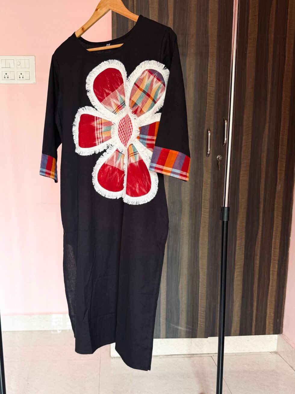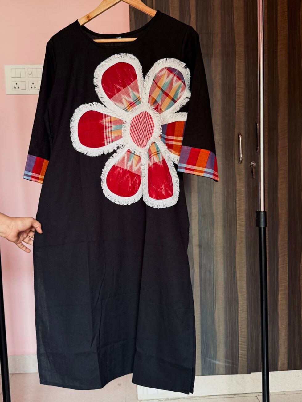 Bold, artsy, and rooted in tradition — this black cotton dress celebrates the beauty of everyday comfort and handcrafted creativity. The standout feature is the floral applique made using authentic Kolkata gamcha fabric, blending vibrant reds and multicolored checks against a deep black backdrop.