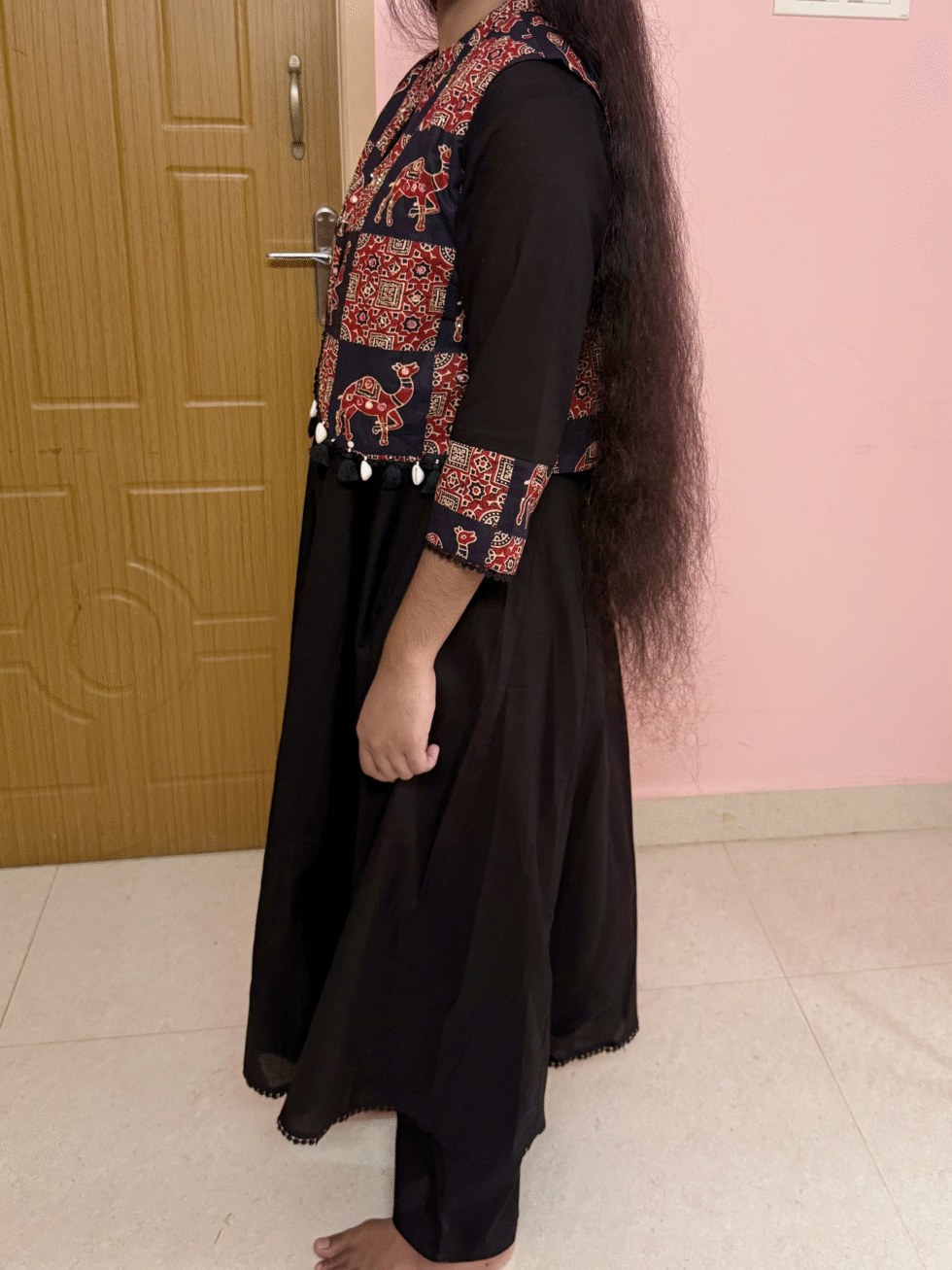 The set comes with a separate jacket, beautifully adorned with camel motifs and intricate detailing. The jacket’s shell tassel detailing enhances its ethnic charm, making it a true statement piece. The combination of earthy tones on the jacket perfectly complements the solid black base of the Anarkali.
