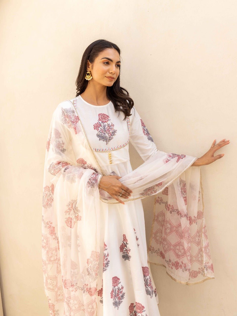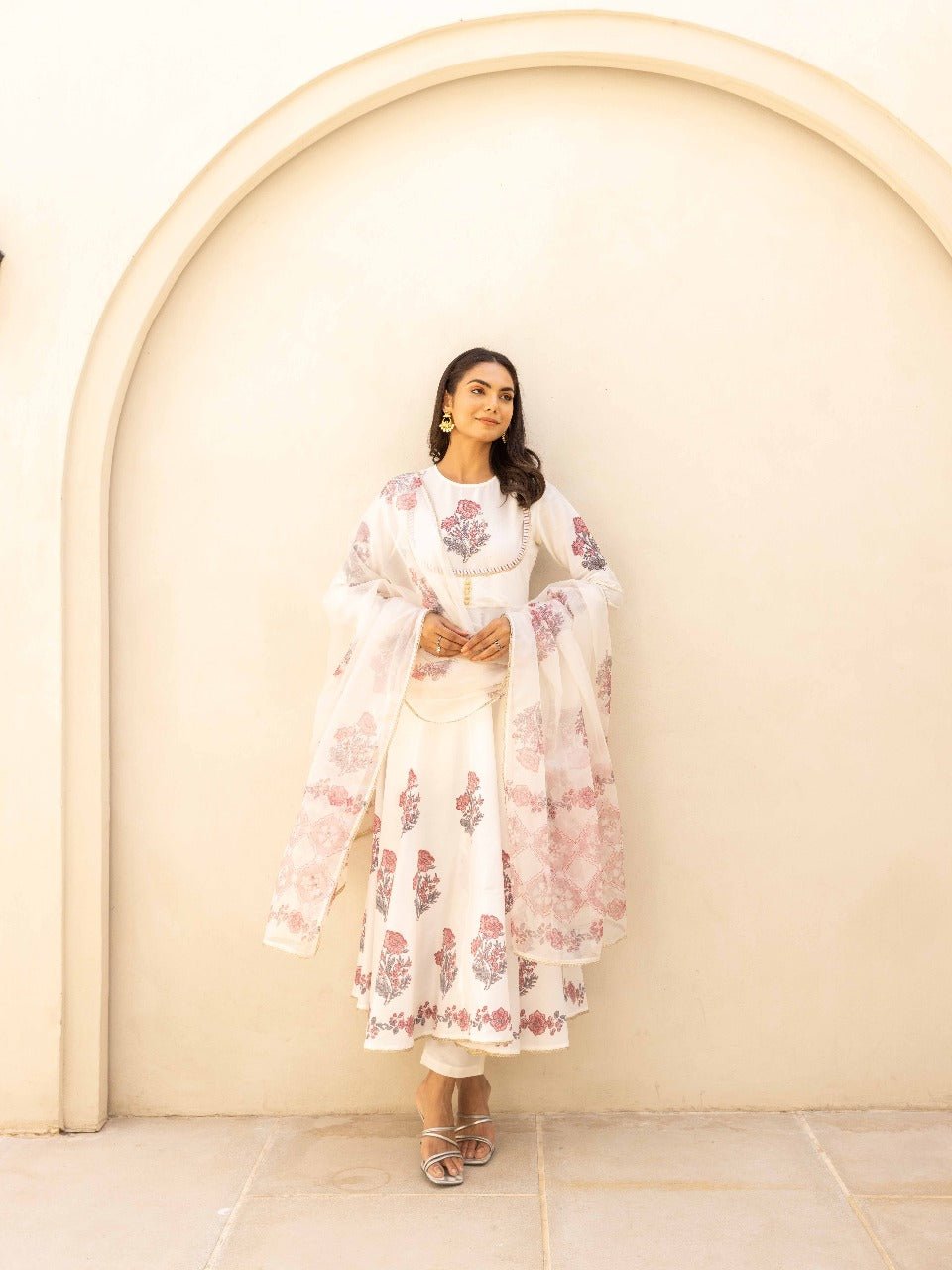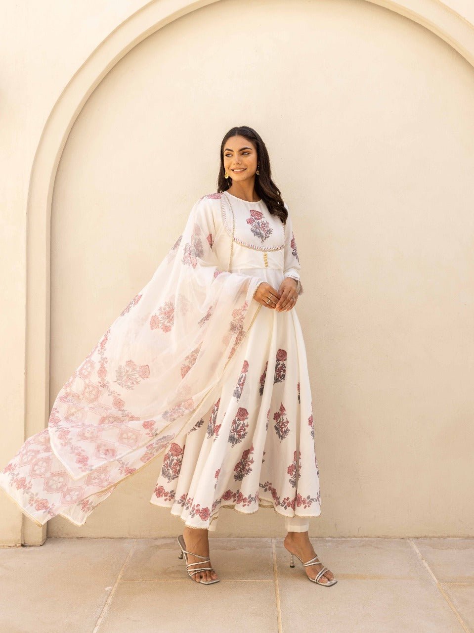 Ivory White Handblock Printed Flared Anarkali Festival Suit