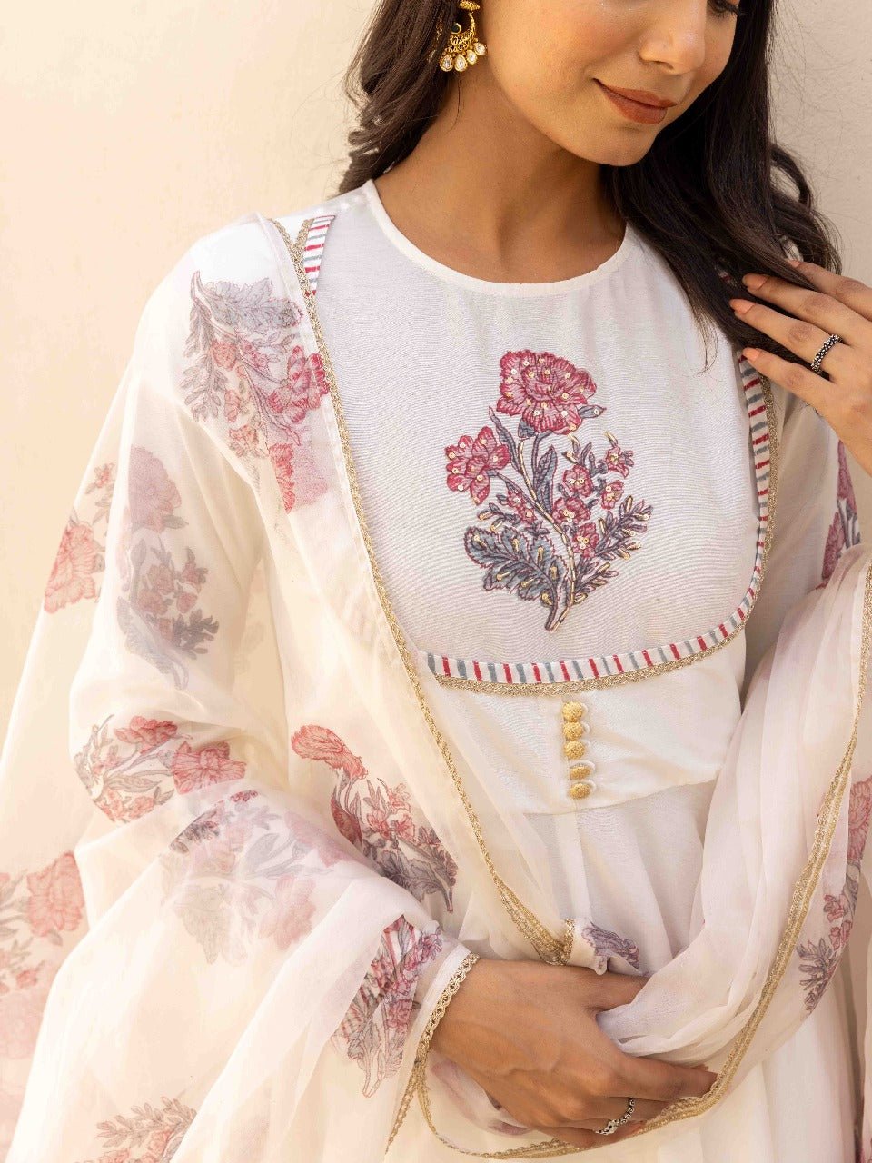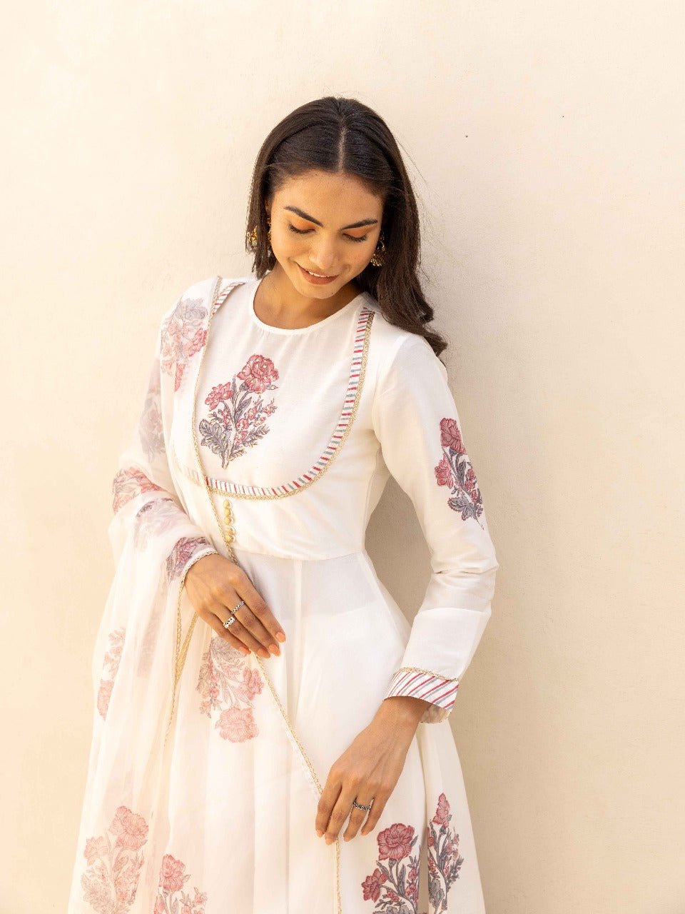 The outfit showcases authentic handblock prints in soft floral motifs, lending a classic yet sophisticated charm. The yoke portion is beautifully detailed with intricate embroidery, striped piping, and delicate buttons, highlighting fine artisanal work.