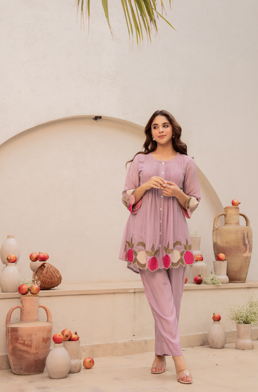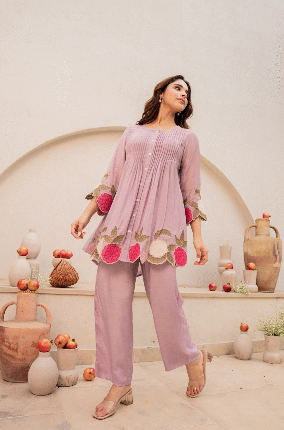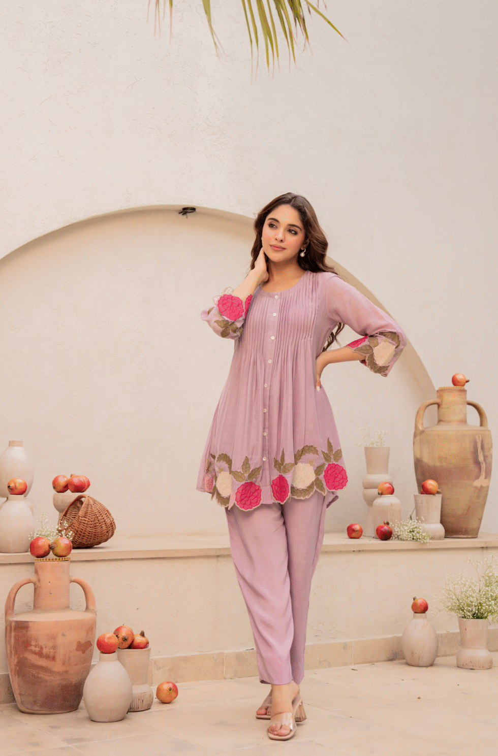 Lilac Chanderi Co-ord Set with Pleated Yoke & Floral Appliqué