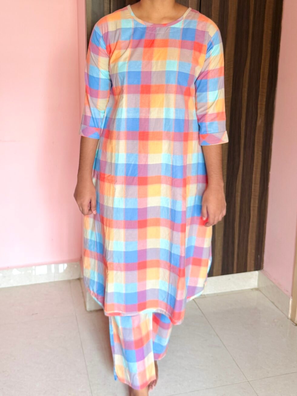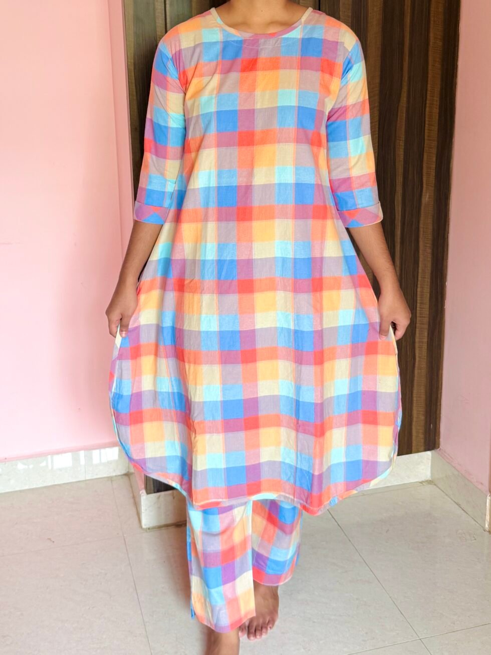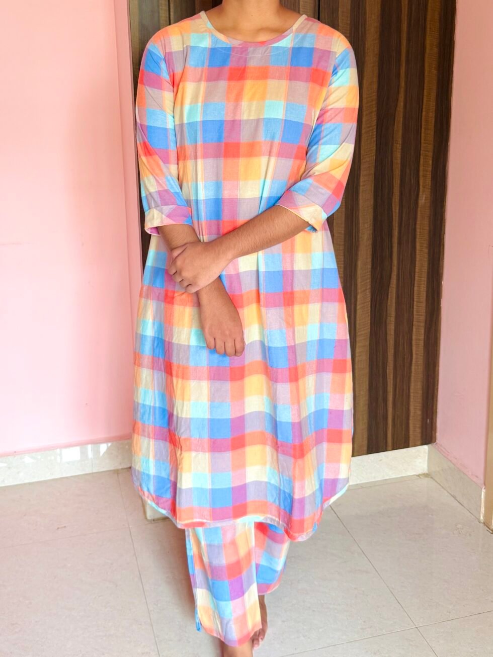 Multicolor Checked Cotton Co-ord Set with Bee Embroidery – Comfortable Everyday Wear for Women