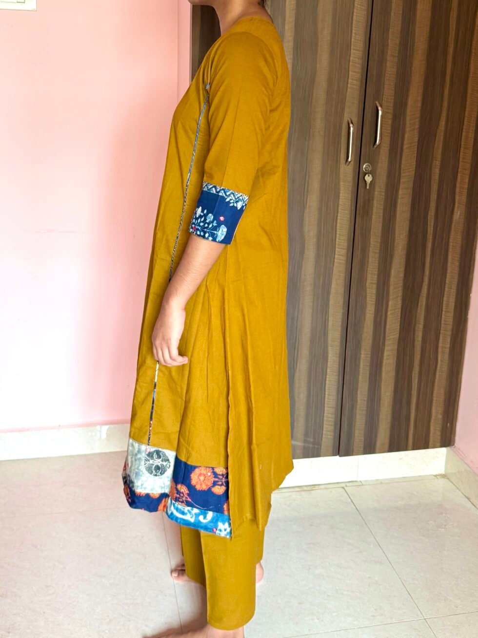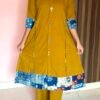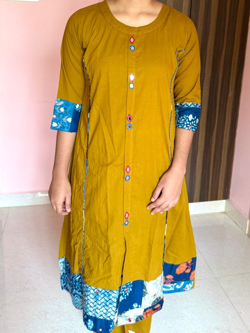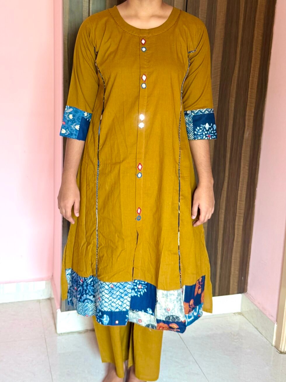 Mustard Cotton Co-ord Set with Mirror Work & Printed Detailing – A-Line Kurta & PalazzoPants