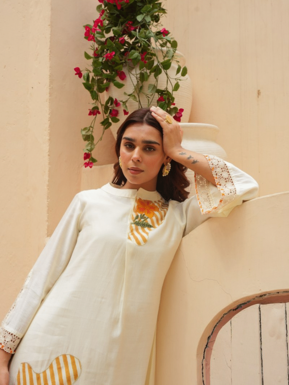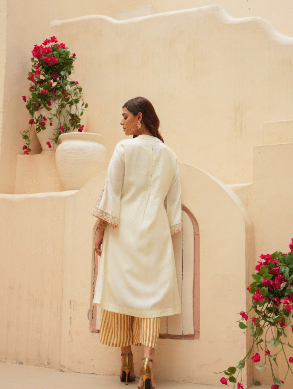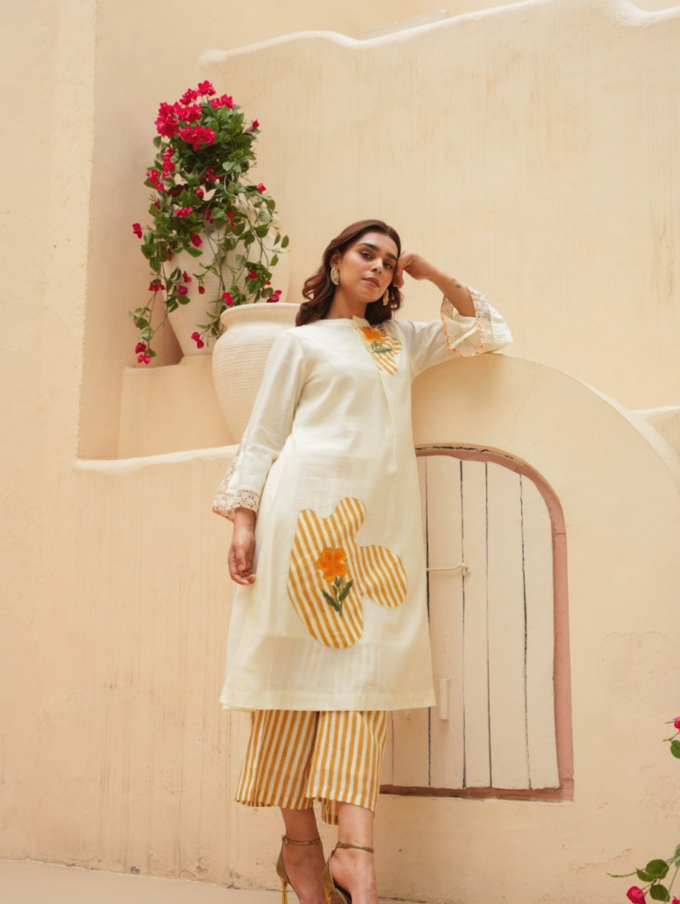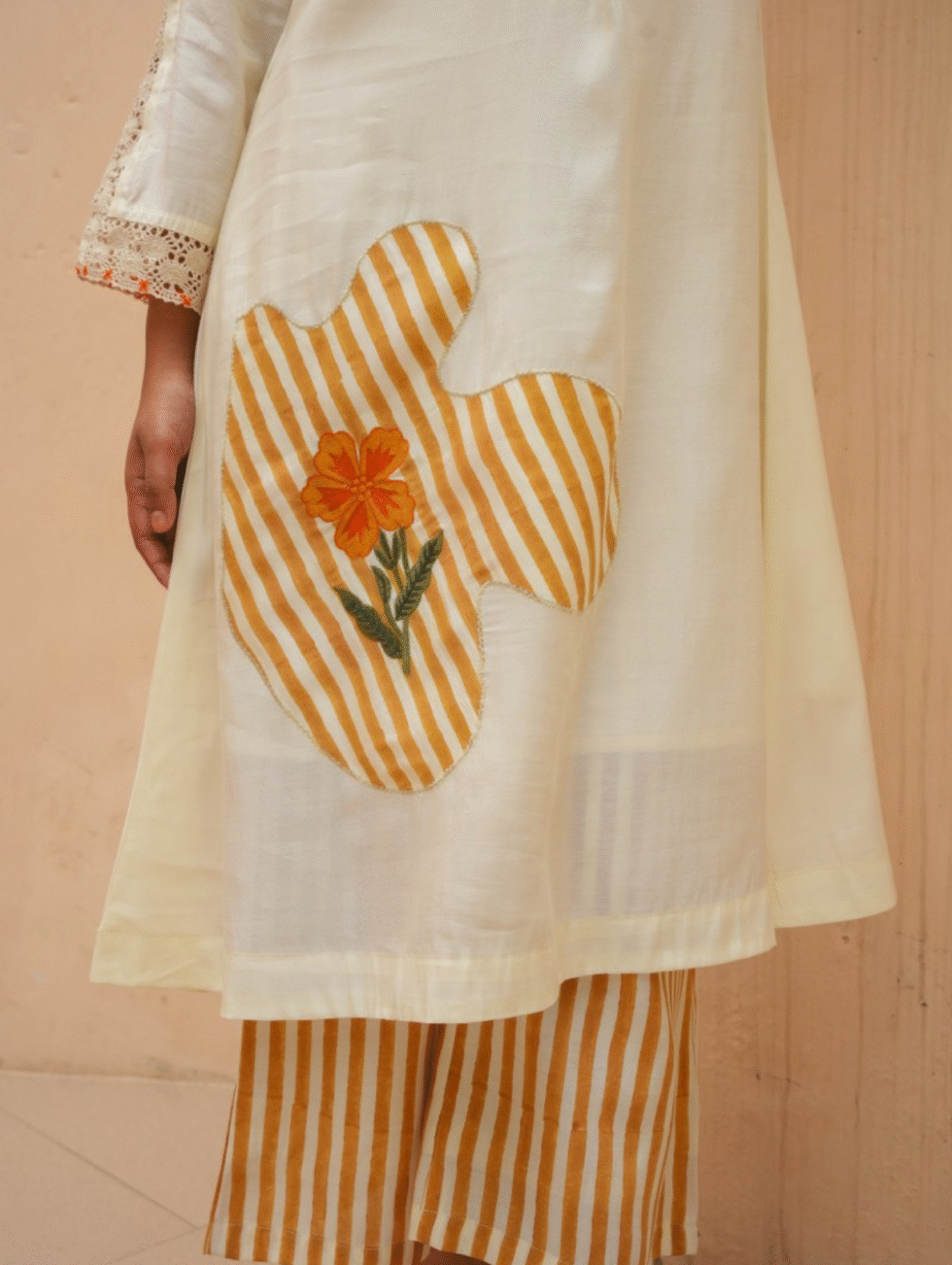 Elevate your ethnic wardrobe with this off-white Roman silk co-ord set that blends comfort with contemporary charm. The knee-length kurta features a round neckline and is adorned with bold floral appliqué against mustard-yellow stripes for a striking contrast. Delicate crochet lace trims enhance the bell sleeves, adding a feminine touch. The matching wide-leg striped palazzo pants bring effortless movement and style. Crafted from opaque woven Roman silk, this set is perfect for casual brunches, festive gatherings, or semi-formal occasions. Its fresh colour palette and artistic detailing make it a statement choice for the modern woman who loves timeless yet trendy ethnic wear.